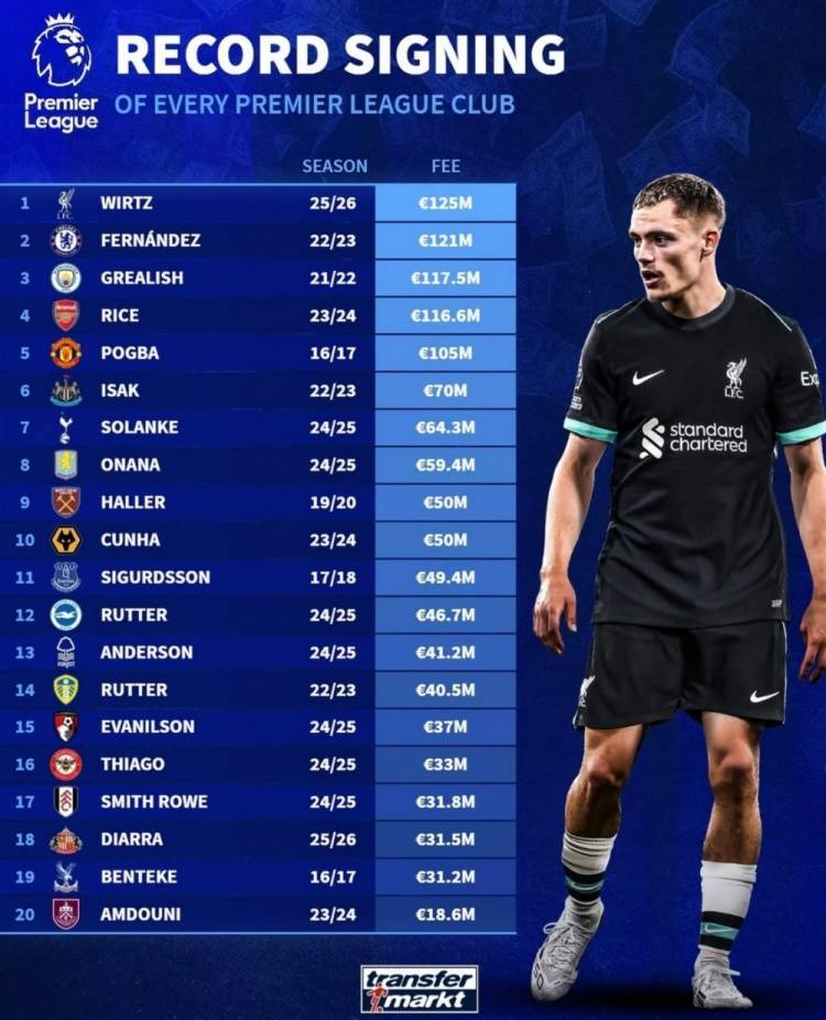 德转列英超球队历史转会费标王:维尔茨领衔,恩佐、格拉利什在列